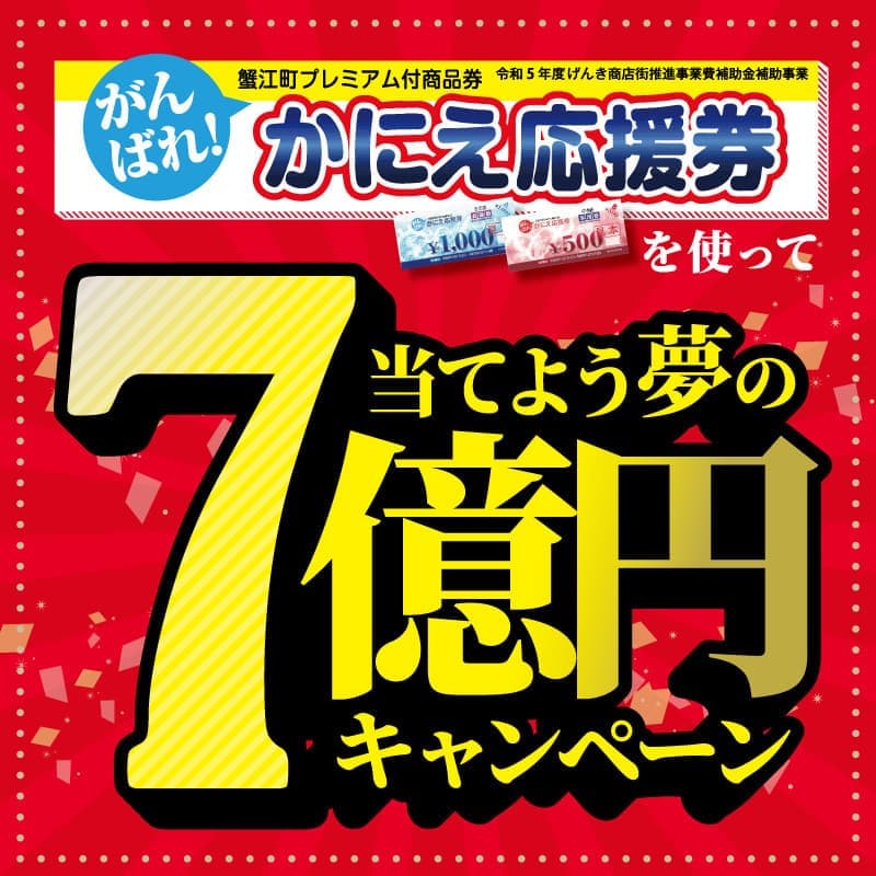 当てよう夢の7億円キャンペーンは、イベント参加店舗にて、各店舗設定金額分の「がんばれ!かにえ応援券」をご利用いただくと、年末ジャンボ宝くじをプレゼントするキャンペーンです。