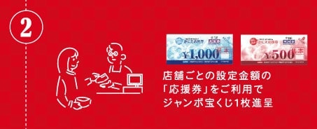 2 店舗ごとの設定金額の「がんばれ!かにえ応援券」をご利用で、ジャンボ宝くじを1枚進呈
